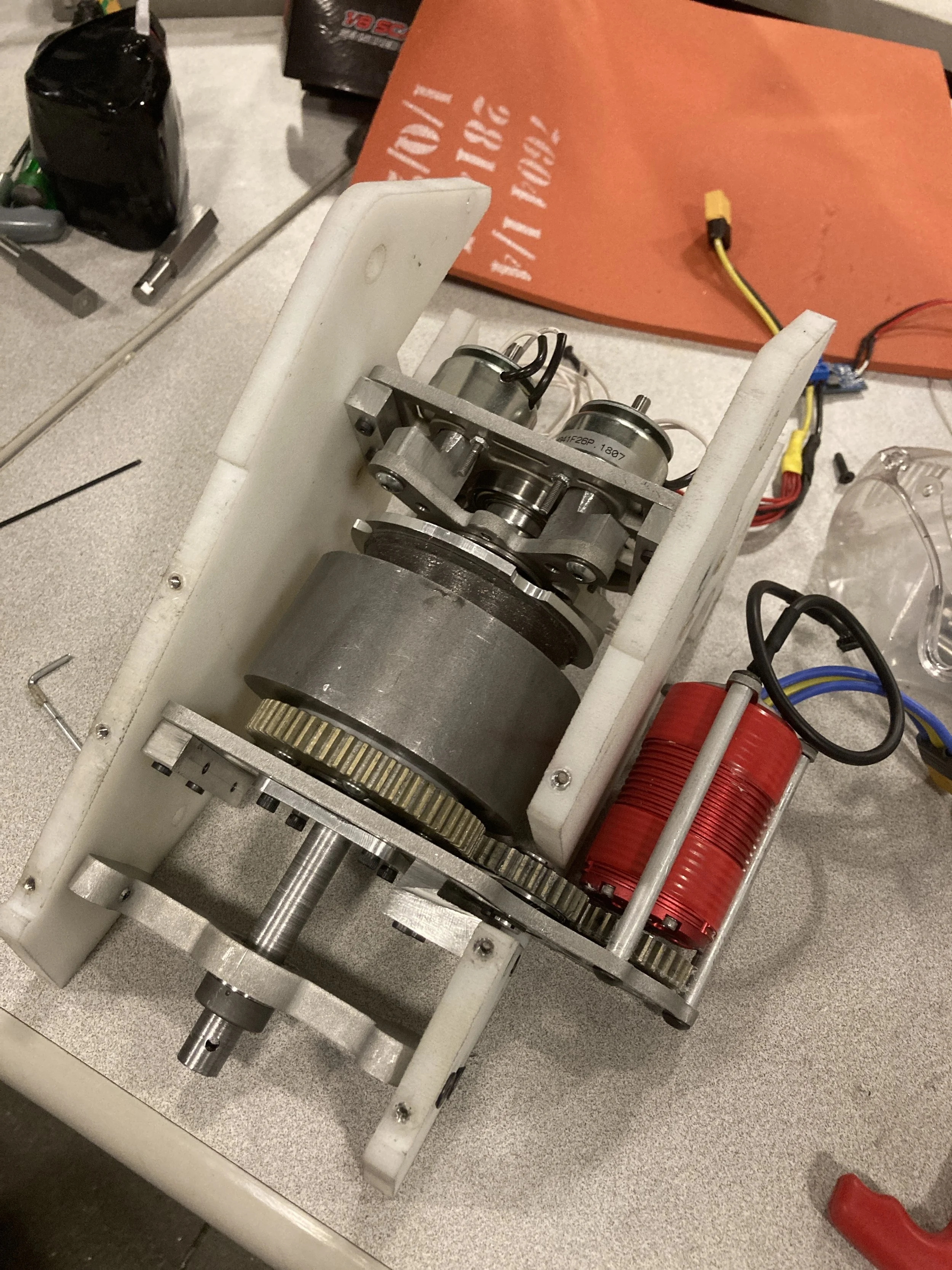 Weapon motor spins a geartrain, which spins up the 3 lbs steel flywheel to store kinetic energy